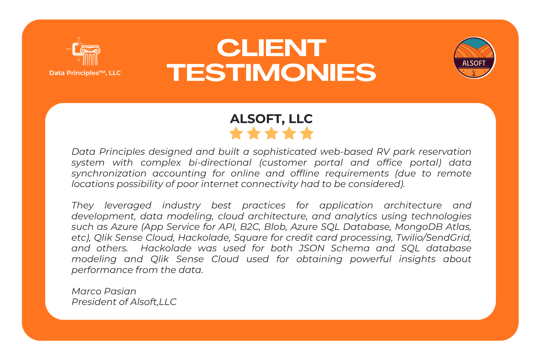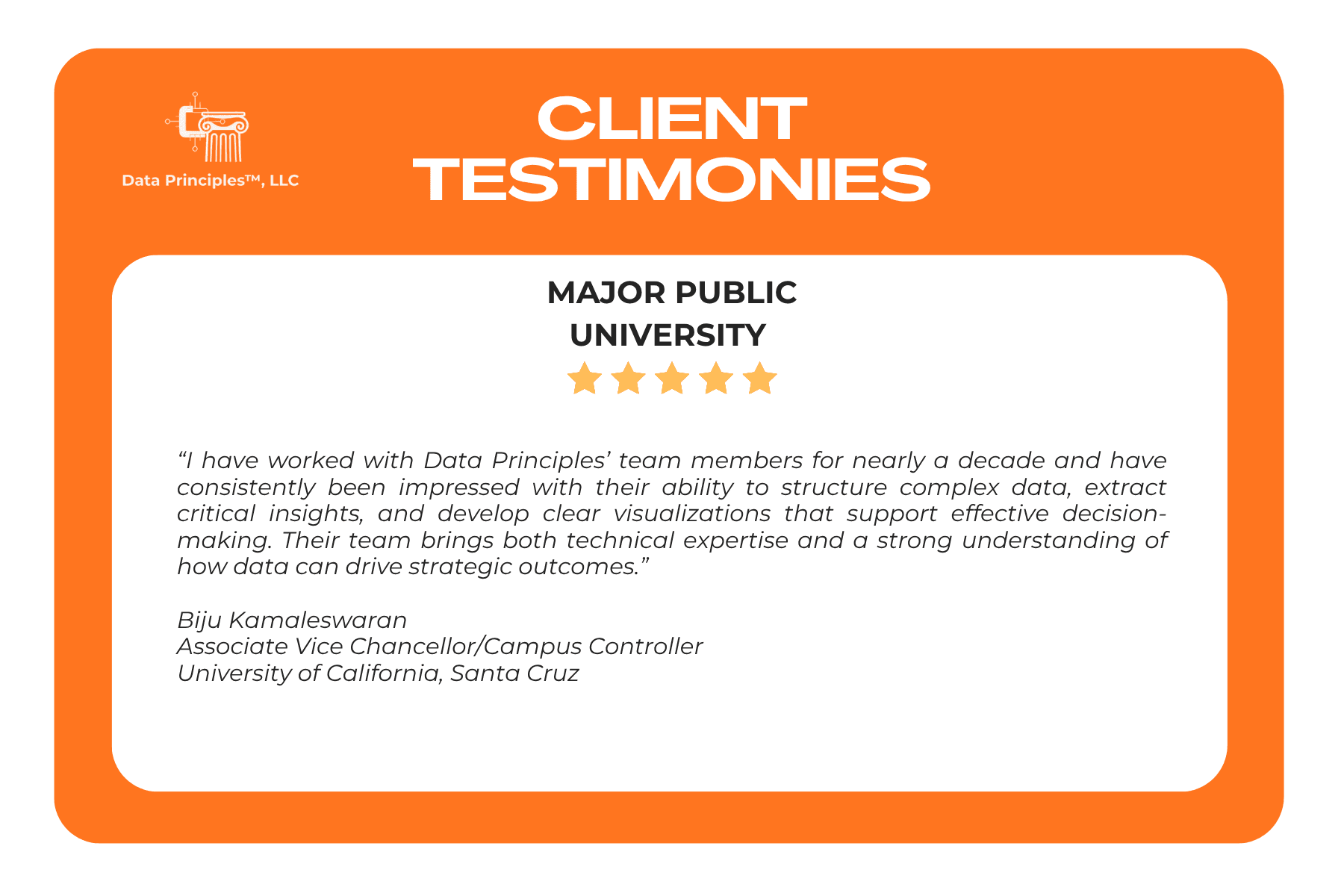 At Data Principles™, we value the relationships we build with our clients. Their testimonials reflect the confidence, partnership, and meaningful outcomes that define our work.